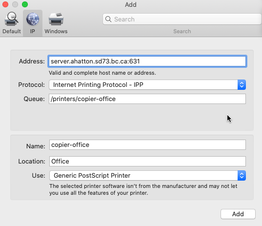 ssh server.ahatton sudo -s cd /home/programs/cups mkdir admin # this is the username that MAC sent to CUPS. nano admin/KMdrv.txt